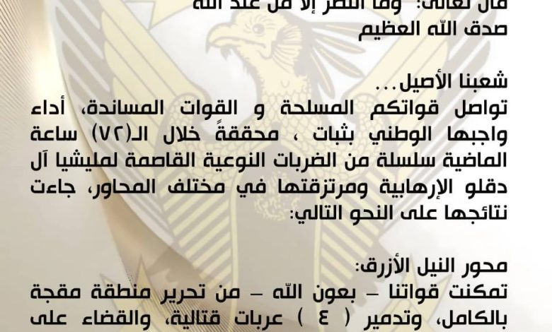 العمليات العسكرية شملت عدد من محاور القتال الخرطوم/ أرض السودان أعلنت القيادة العامة للقوات المسلحة تحقيق سلسلة من النجاحات الميدانية…